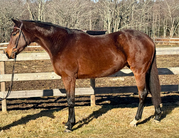 Hope only has 4 starts under her belt. Her trainer retired her because she didn't show interest in being a racehorse. She does have a cold right front bow that occurred before her short lived racing career. Her trainer rehabbed her properly, and did race on it without any lameness issues. Since being at the farm, she has never taken a lame step. ​Hope has GREAT feet and is currently barefoot. She is turned out with a small group of mares.