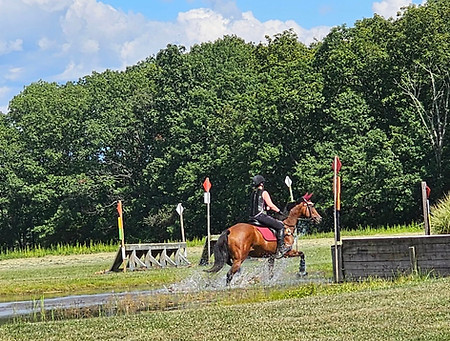 9/1/25- Kizzie went to her first Cross Country schooling, and she was FANTASTIC. No, I’m not just saying that (okay maybe so). She did the up and down BN banks and ditch without hesitation, I schooled her over all the starter level fences, and was going through the water complex without hesitation at the end of our ride. I always start with walking through the water in the beginning of the ride to introduce it, she was a looky at the water but I expected it for her first time ever going through. By the end of our ride she was trotting/cantering through it. Kizzie is the kind of horse that if you set the pace and she will maintain it, and has easy breaks.